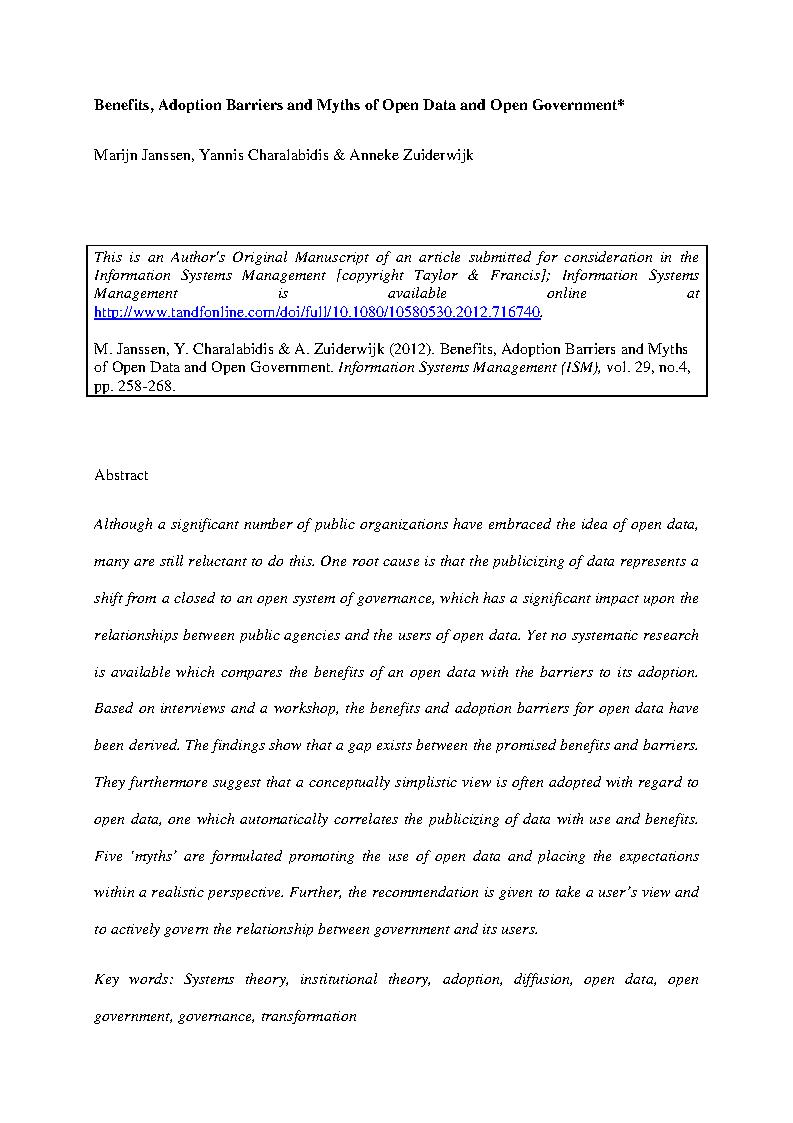 Although a significant number of public organizations have embraced the idea of open data, many are still reluctant to do this. One root cause is that the publicizing of data represents a shift from a closed to an open system of governance, which has a significant impact upon the relationships between public agencies and the users of open data. Yet no systematic research is available which compares the benefits of an open data with the barriers to its adoption. Based on interviews and a workshop, the benefits and adoption barriers for open data have been derived. The findings show that a gap exists between the promised benefits and barriers. They furthermore suggest that a conceptually simplistic view is often adopted with regard to open data, one which automatically correlates the publicizing of data with use and benefits. Five ‘myths’ are formulated promoting the use of open data and placing the expectations within a realistic perspective. Further, the recommendation is given to take a user’s view and to actively govern the relationship between government and its users.