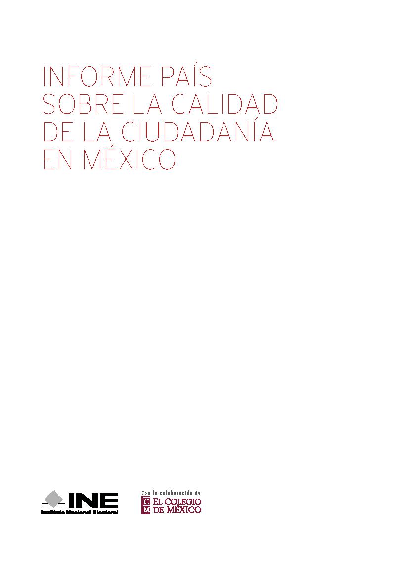 En el marco del objetivo estratégico de “Contribuir al diseño e implementación de prácticas y políticas públicas que favorezcan la construcción de ciudadanía en México” de la ENEC 2011-2015, el proyecto Informe país sobre la calidad de la ciudadanía en México – desarrollado de manera conjunta con El Colegio de México- tiene como objetivo poner a disposición de la sociedad información objetiva, actualizada y relevante sobre valores, percepciones y prácticas de la ciudadanía en nuestro país, a través de seis dimensiones analíticas: Estado de Derecho y Acceso a la Justicia; Participación Política; Sociedad Civil y Participación no Electoral; Vida Comunitaria; Valores Democráticos; Redes de Asociación e Implementación. Dicha información fue generada a través de una encuesta a ciudadanos, representativa a nivel nacional y de un estudio focalizado dirigido a indagar sobre las asociaciones ciudadanas y sus redes de colaboración. Un equipo de reconocidos especialistas en el ámbito de la investigación social fue responsable de la elaboración de los fundamentos teóricos, metodológicos y analíticos del proyecto. Los datos y las conclusiones del Informe país buscan ser un referente que aporte a la comprensión de los factores que inciden en la construcción de una ciudadanía democrática y a la formulación de acciones y políticas públicas dirigidas al fortalecimiento de los derechos ciudadanos de las y los mexicanos.