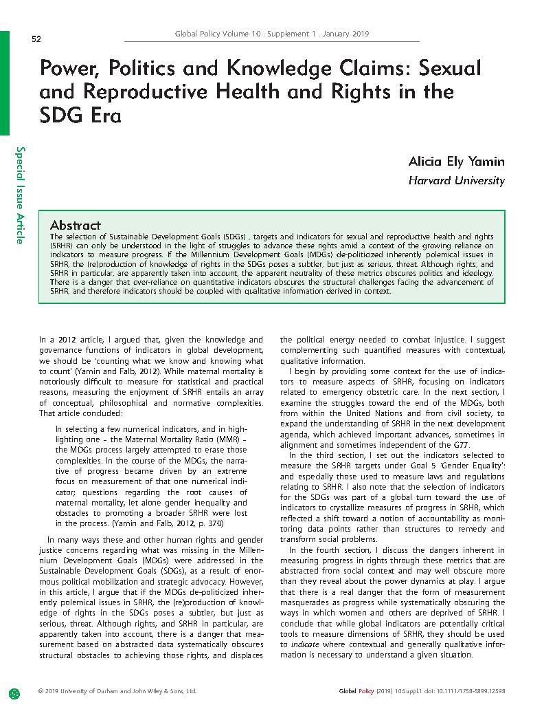 The selection of Sustainable Development Goals (SDGs) , targets and indicators for sexual and reproductive health and rights (SRHR) can only be understood in the light of struggles to advance these rights amid a context of the growing reliance on indicators to measure progress. If the Millennium Development Goals (MDGs) de?politicized inherently polemical issues in SRHR, the (re)production of knowledge of rights in the SDGs poses a subtler, but just as serious, threat. Although rights, and SRHR in particular, are apparently taken into account, the apparent neutrality of these metrics obscures politics and ideology. There is a danger that over?reliance on quantitative indicators obscures the structural challenges facing the advancement of SRHR, and therefore indicators should be coupled with qualitative information derived in context.