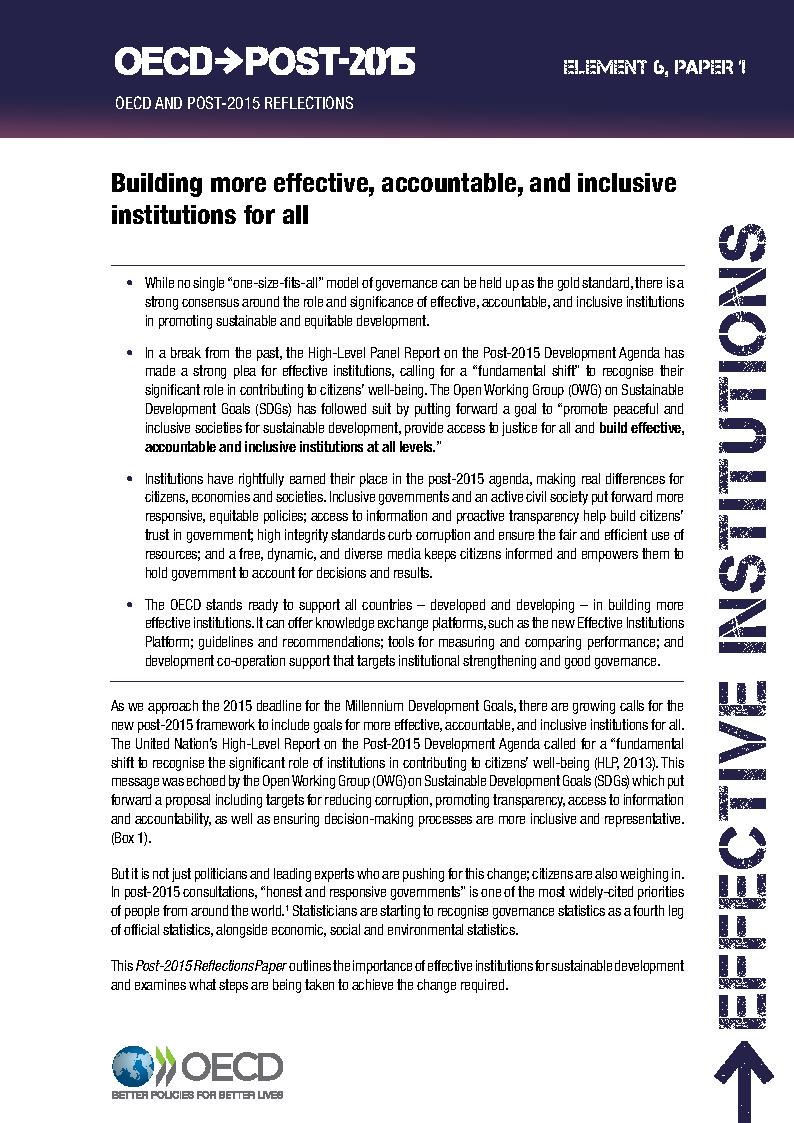 The United Nation’s High-Level Report on the Post-2015 Development Agenda called for a “fundamental shift to recognise the significant role of institutions in contributing to citizens’ well-being (HLP, 2013). This message was echoed by the Open Working Group (OWG) on Sustainable Development Goals (SDGs) which put forward a proposal including targets for reducing corruption, promoting transparency, access to information and accountability, as well as ensuring decision-making processes are more inclusive and representative. Statisticians are starting to recognise governance statistics as a fourth leg of official statistics, alongside economic, social and environmental statistics. This Post-2015 Reflections Paper outlines the importance of effective institutions for sustainable development and examines what steps are being taken to achieve the change required.