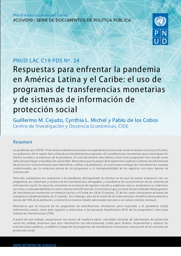 La pandemia por COVID-19 ha hecho evidente la promesa incumplida de la protección social en América Latina y el Caribe. Los gobiernos de la región han utilizado primordialmente programas de transferencias monetarias para amortiguar los efectos sociales y económicos de la pandemia. En este documento describimos cómo estos programas han servido como vehículo para llegar a la población vulnerable. Mostramos que los países de la región han usado los sistemas de información de protección social existentes para identificar o afiliar a la población, así como para entregar las transferencias, aunque condicionados por la cobertura previa de los programas y la interoperabilidad de los registros con otras fuentes de información. Para ello, analizamos las respuestas a la pandemia, distinguiendo las formas en las que los países innovaron con sus programas, las coberturas y montos de las transferencias entregadas, y estudiamos las características de los sistemas de información social.