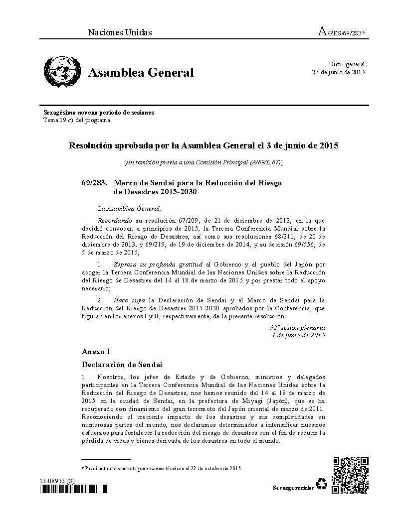 El Marco de Sendai es el instrumento sucesor del Marco de Acción de Hyogo para 2005-2015: Aumento de la resiliencia de las naciones y las comunidades ante los desastres. El Marco de Acción de Hyogo se concibió para dar un mayor impulso a la labor mundial en relación con el Marco Internacional de Acción del Decenio Internacional para la Reducción de los Desastres Naturales de 1989 y la Estrategia de Yokohama para un Mundo Más Seguro: Directrices para la prevención de los desastres naturales, la preparación para casos de desastre y la mitigación de sus efectos, adoptada en 1994, así como su Plan de Acción, y la Estrategia Internacional para la Reducción de los Desastres de 1999.