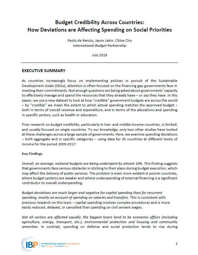 A medida que los países se centran cada vez más en cumplir los Objetivos de Desarrollo Sostenible (ODS), la atención se centra a menudo en la brecha financiera que enfrentan los gobiernos para cumplir sus compromisos. No se están haciendo las suficientes preguntas sobre la capacidad de los gobiernos para administrar y gastar de manera efectiva los recursos que ya tienen, o los que dicen que tienen. En este documento, se usan un conjunto de datos para ver cómo los presupuestos gubernamentales "creíbles" se encuentran en todo el mundo. Por "creíble" se refieren a la medida en que el gasto real corresponde con el presupuesto aprobado, y cómo el gasto en áreas específicas del gobierno se ve afectado.