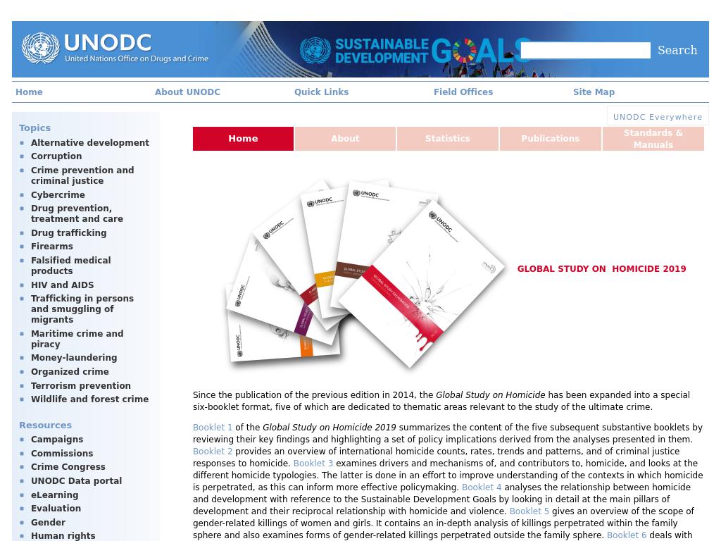 Consta de cinco folletos temáticos, cada uno de los cuales ofrece una visión de las facetas y dimensiones específicas de este complejo fenómeno: tendencias y patrones de homicidio; impulsores, mecanismos y tipologías de homicidio; homicidio y desarrollo sostenible; asesinatos de mujeres y niñas relacionados con el género; y asesinatos de niños y adultos jóvenes. Un sexto folleto adicional consiste en el resumen ejecutivo y las implicaciones para las políticas públicas.