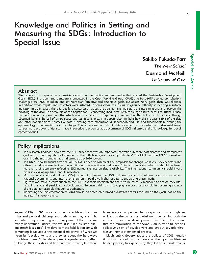 The papers in this special issue provide accounts of the politics and knowledge that shaped the Sustainable Development Goals (SDGs). The open and transparent processes in the Open Working Group (OWG) and Post?2015 agenda consultations challenged the MDG paradigm and set more transformative and ambitious goals. But across many goals, there was slippage in ambition when targets and indicators were selected. In some cases, this is due to genuine difficulty in defining a suitable indicator. In other cases, there is clearly a contestation about the agenda, and indicators are used to reorient or pervert the meaning of the goal. The accounts of the negotiations– concerning inequality, sustainable agriculture, access to justice, education, environment – show how the selection of an indicator is purportedly a technical matter but is highly political, though obscured behind the veil of an objective and technical choice. The papers also highlight how the increasing role of big data and other non?traditional sources of data is altering data production, dissemination and use, and fundamentally altering the epistemology of information and knowledge. This raises questions about ‘data for whom and for what’ – fundamental issues concerning the power of data to shape knowledge, the democratic governance of SDG indicators and of knowledge for development overall.