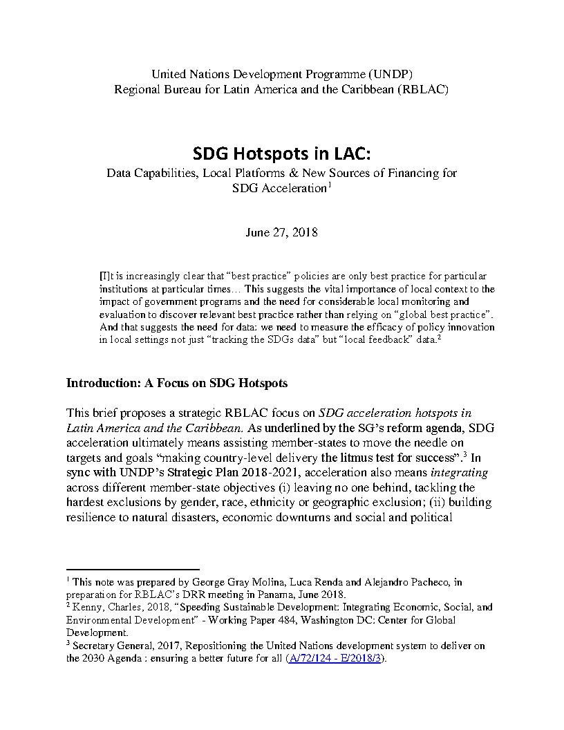 This brief proposes a strategic RBLAC focus on SDG acceleration hotspots in Latin America and the Caribbean. As underlined by the SG’s reform agenda, SDG acceleration ultimately means assisting member-states to move the needle on targets and goals “making country-level delivery the litmus test for success”. In sync with UNDP’s Strategic Plan 2018-2021, acceleration also means integrating across different member-state objectives (i) leaving no one behind, tackling the hardest exclusions by gender, race, ethnicity or geographic exclusion; (ii) building resilience to natural disasters, economic downturns and social and political conflict; and (iii) promoting structural transformations that ensure sustainable development.