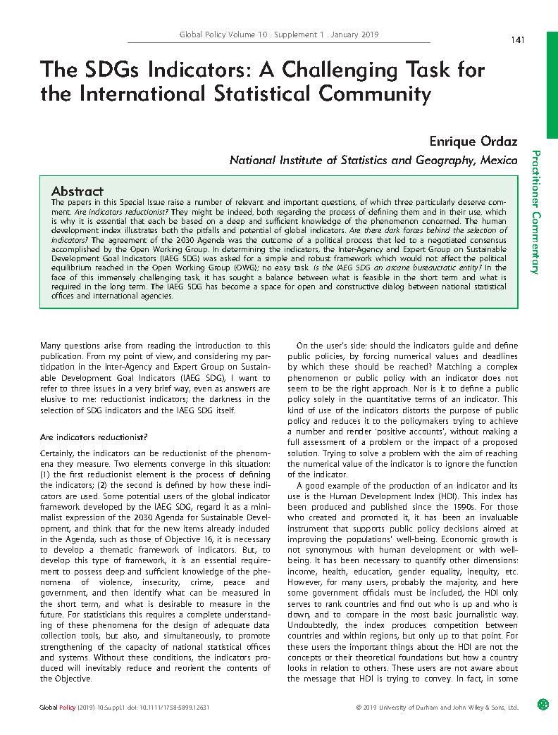 The papers in this Special Issue raise a number of relevant and important questions, of which three particularly deserve comment. Are indicators reductionist? They might be indeed, both regarding the process of defining them and in their use, which is why it is essential that each be based on a deep and sufficient knowledge of the phenomenon concerned. The human development index illustrates both the pitfalls and potential of global indicators. Are there dark forces behind the selection of indicators? The agreement of the 2030 Agenda was the outcome of a political process that led to a negotiated consensus accomplished by the Open Working Group. In determining the indicators, the Inter-Agency and Expert Group on Sustainable Development Goal Indicators (IAEG SDG) was asked for a simple and robust framework which would not affect the political equilibrium reached in the Open Working Group (OWG); no easy task. Is the IAEG SDG an arcane bureaucratic entity? In the face of this immensely challenging task, it has sought a balance between what is feasible in the short term and what is required in the long term. The IAEG SDG has become a space for open and constructive dialog between national statistical offices and international agencies.