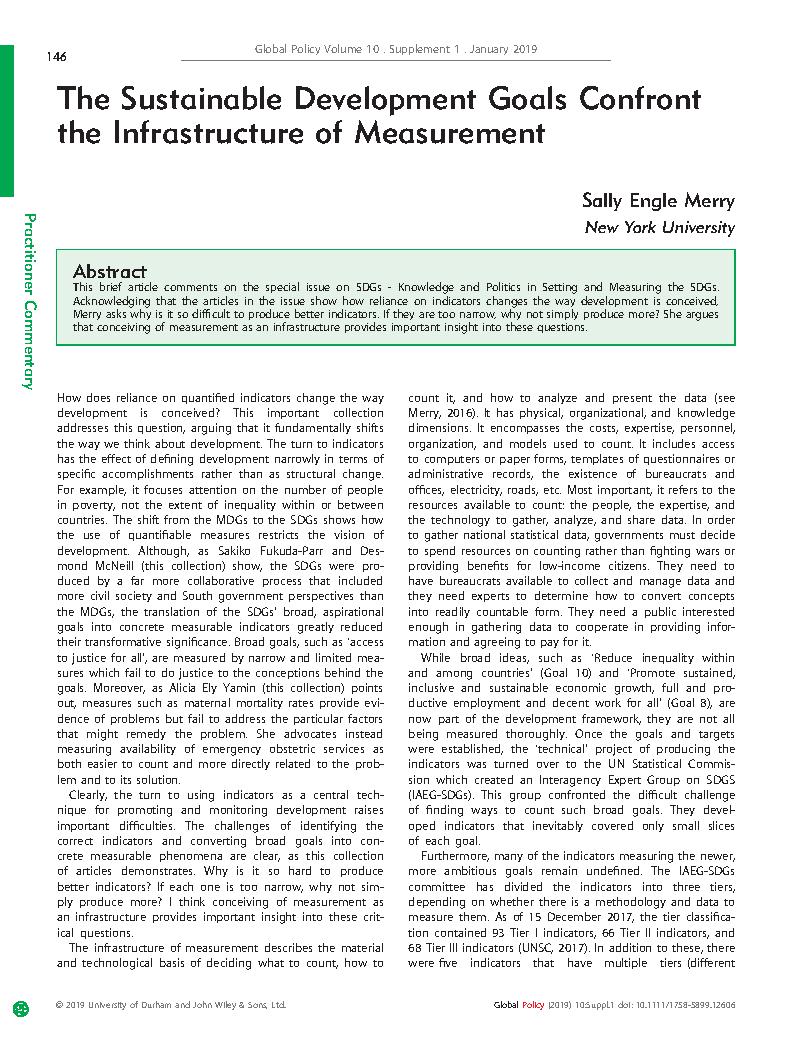 This brief article comments on the special issue on SDGs - Knowledge and Politics in Setting and Measuring the SDGs. Acknowledging that the articles in the issue show how reliance on indicators changes the way development is conceived,Merry asks why is it so difficult to produce better indicators. If they are too narrow, why not simply produce more? She arguesthat conceiving of measurement as an infrastructure provides important insight into these questions.