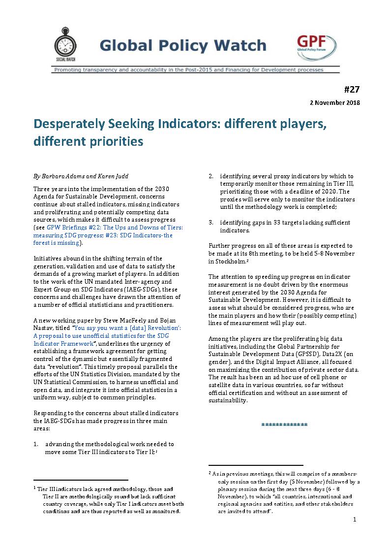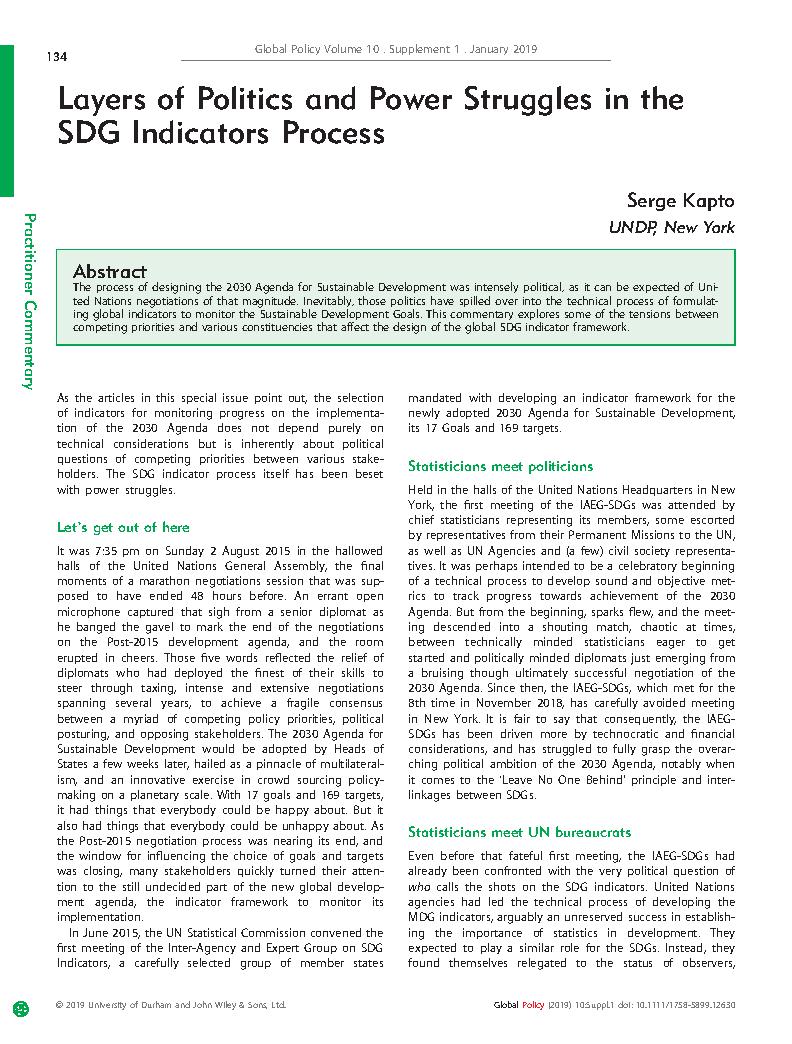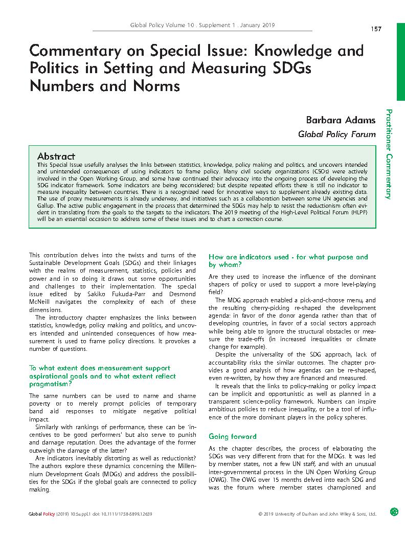 This Special Issue usefully analyses the links between statistics, knowledge, policy making and politics, and uncovers intended and unintended consequences of using indicators to frame policy. Many civil society organizations (CSOs) were actively involved in the Open Working Group, and some have continued their advocacy into the ongoing process of developing the SDG indicator framework. Some indicators are being reconsidered; but despite repeated efforts there is still no indicator to measure inequality between countries. There is a recognized need for innovative ways to supplement already existing data. The use of proxy measurements is already underway, and initiatives such as a collaboration between some UN agencies and Gallup. The active public engagement in the process that determined the SDGs may help to resist the reductionism often evident in translating from the goals to the targets to the indicators. The 2019 meeting of the High?Level Political Forum (HLPF) will be an essential occasion to address some of these issues and to chart a correction course.