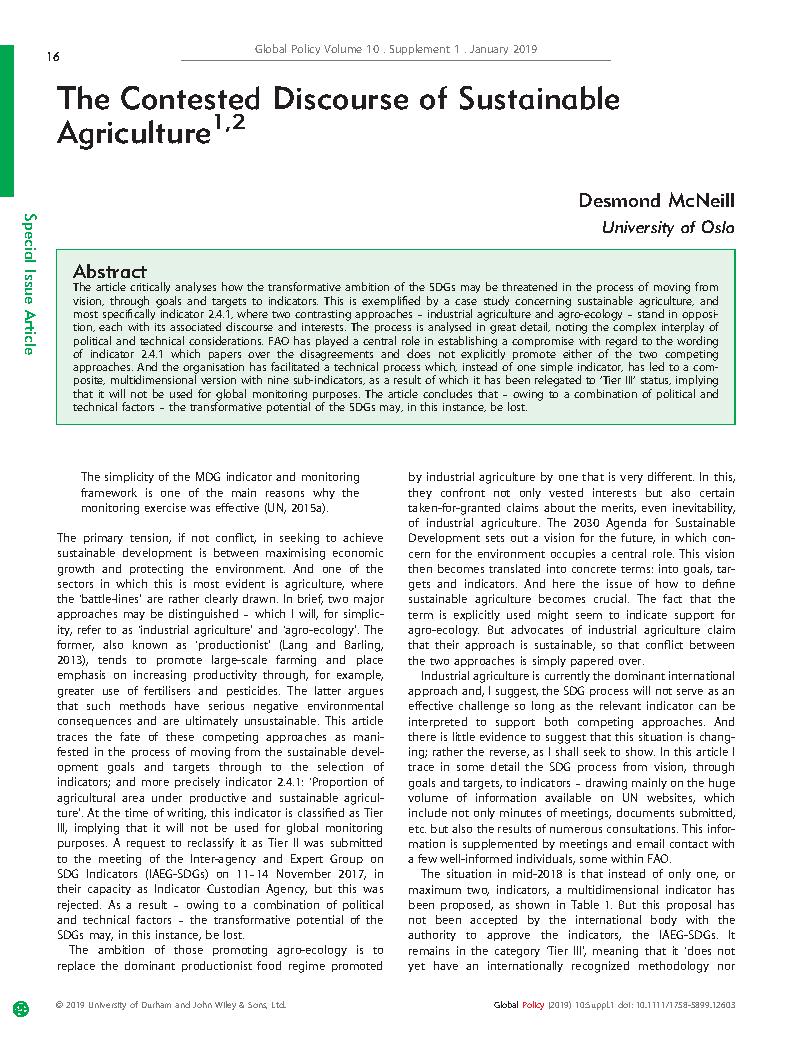 The article critically analyses how the transformative ambition of the SDGs may be threatened in the process of moving from vision, through goals and targets to indicators. This is exemplified by a case study concerning sustainable agriculture, and most specifically indicator 2.4.1, where two contrasting approaches – industrial agriculture and agro?ecology – stand in opposition, each with its associated discourse and interests. The process is analysed in great detail, noting the complex interplay of political and technical considerations. FAO has played a central role in establishing a compromise with regard to the wording of indicator 2.4.1 which papers over the disagreements and does not explicitly promote either of the two competing approaches. And the organisation has facilitated a technical process which, instead of one simple indicator, has led to a composite, multidimensional version with nine sub?indicators, as a result of which it has been relegated to ‘Tier III’ status, implying that it will not be used for global monitoring purposes. The article concludes that – owing to a combination of political and technical factors – the transformative potential of the SDGs may, in this instance, be lost. In order to transform the debate it is necessary, and should be sufficient, to show that–already today–agro?ecological approaches can achieve high yields.