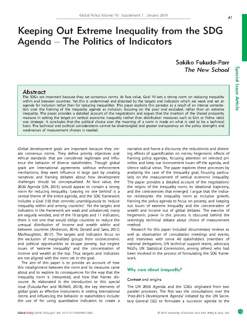The SDGs are important because they set consensus norms. At face value, Goal 10 sets a strong norm on reducing inequality within and between countries. Yet this is undermined and distorted by the targets and indicators which are weak and set an agenda for inclusion rather than for reducing inequalities. This paper explains this paradox as a result of an intense contestation over the framing of the inequality agenda as inclusion, focusing on the poor and excluded, rather than on extreme inequality. The paper provides a detailed account of the negotiations and argues that the insertion of the shared prosperity measure in setting the target on vertical economic inequality (rather than distribution measures such as Gini or Palma ratio) was strategic. It concludes that the political choice over the meaning of a norm is made on what is said to be a technical basis. The technical and political considerations cannot be disentangled and greater transparency on the policy strengths and weaknesses of measurement choices is needed.