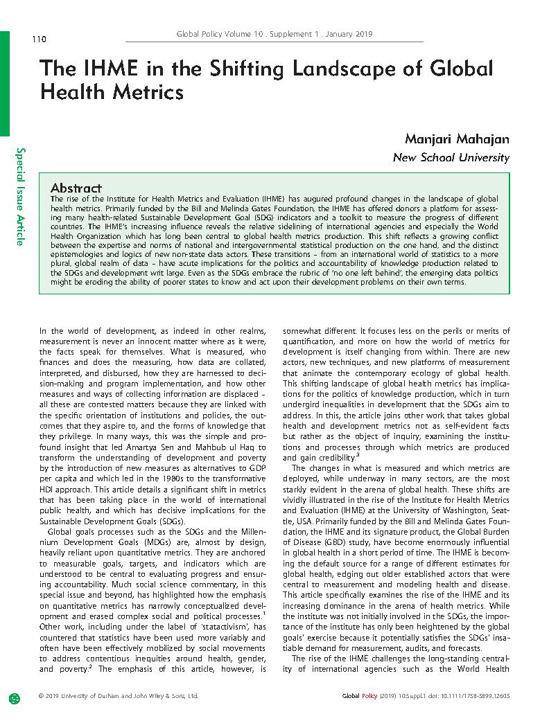 The rise of the Institute for Health Metrics and Evaluation (IHME) has augured profound changes in the landscape of global health metrics. Primarily funded by the Bill and Melinda Gates Foundation, the IHME has offered donors a platform for assessing many health?related Sustainable Development Goal (SDG) indicators and a toolkit to measure the progress of different countries. The IHME's increasing influence reveals the relative sidelining of international agencies and especially the World Health Organization which has long been central to global health metrics production. This shift reflects a growing conflict between the expertise and norms of national and intergovernmental statistical production on the one hand, and the distinct epistemologies and logics of new non?state data actors. These transitions – from an international world of statistics to a more plural, global realm of data – have acute implications for the politics and accountability of knowledge production related to the SDGs and development writ large. Even as the SDGs embrace the rubric of ‘no one left behind’, the emerging data politics might be eroding the ability of poorer states to know and act upon their development problems on their own terms.