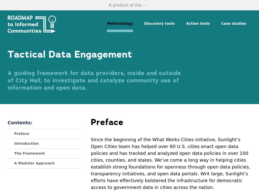 El uso comunitario de los datos abiertos se basa, en esencia, en valorar radicalmente las necesidades de los habitantes, así como los resultados que los gobiernos y habitantes pueden lograr juntos cuando estos últimos se colocan en el centro de la innovación tecnológica y de datos. Creemos en la idea de que las personas son expertas en sus propias vidas y han incluido compromisos explícitos con el diseño centrado en el ser humano en esta guía. Esta guía alienta a los lectores a preguntar: ¿Qué pueden hacer los gobiernos para facilitar activamente las oportunidades para el uso de datos abiertos en las comunidades? ¿Dónde están las brechas de información que los gobiernos podrían ayudar a cerrar? ¿Y cómo puede el gobierno convertirse en un socio igualitario con los habitantes para aprovechar los datos abiertos para el impacto en la comunidad?