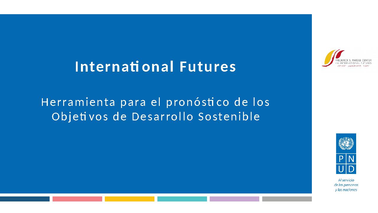 International Futures es una herramienta de pronostico global integrado de largo plazo, diseñado para facilitar el análisis de futuros globales con información de 186 países. Su modelo permite a los usuarios analizar las tendencias e interacciones dentro y entre diversos subsistemas, conocidos como módulos, por medio del desarrollo de escenarios. Su aplicación para la Agenda 2030 permitirá explorar distintas políticas públicas y estrategias con posibles sinergias y trade-offs.