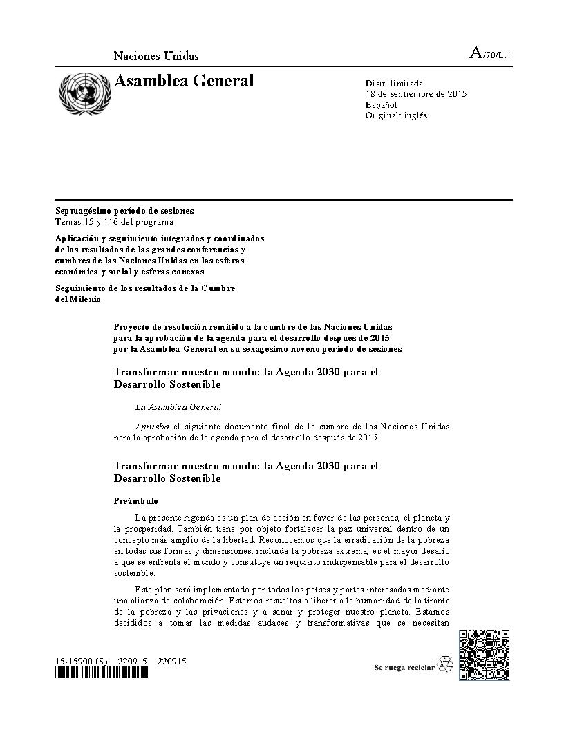 Proyecto de resolución remitido a la cumbre de las Naciones Unidas para la aprobación de la agenda para el desarrollo después de 2015 por la Asamblea General en su sexagésimo noveno período de sesiones