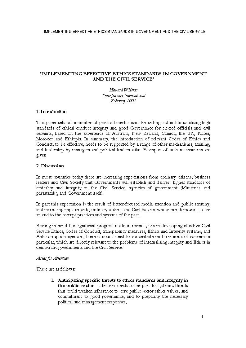This paper sets out a number of practical mechanisms for setting and institutionalising high standards of ethical conduct integrity and good Governance for elected officials and civil servants, based on the experience of Australia, New Zealand, Canada, the UK, Korea, Morocco and Ethiopia. In summary, the introduction of relevant Codes of Ethics and Conduct, to be effective, needs to be supported by a range of other mechanisms, training, and leadership by managers and political leaders alike. Examples of such mechanisms are given.